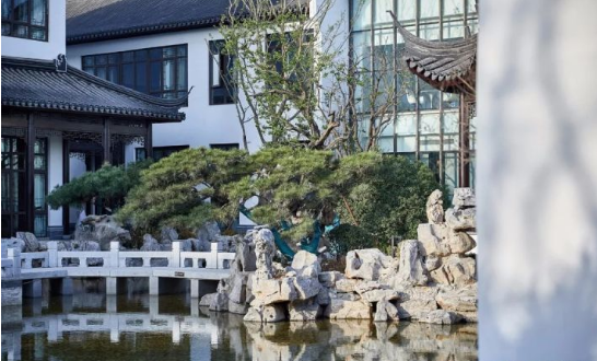 院子借鑒了蘇州留園的方式, 將傳統與現代元素結合,并將此理念貫穿于整個設計中, 從前庭到后院流溢中國庭院精巧細致的濃郁文化氣質。穿過水景,再入庭院,“清泉石流”內園之布局變幻莫測,假山疊水、石臺亭閣,垂柳青松,猶如一幅揮墨而作的山水畫。