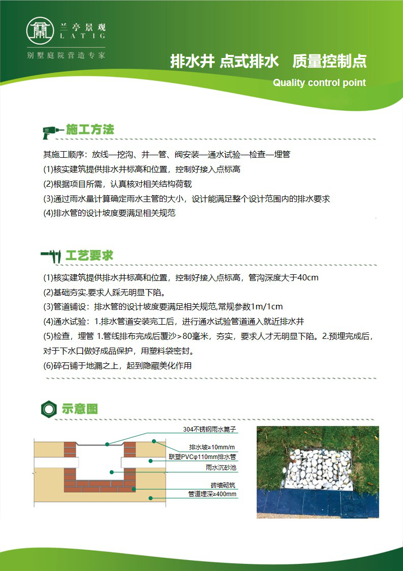 蘭亭景觀引進了專業水電工程設計,強化了庭院快速排水設計,以“雨停地干,不留積水”為設計目標,制定了非常詳細的《繪綠園林快速排水設計規范》,設計標準滿足降水量達到50毫米以上的暴雨環境。