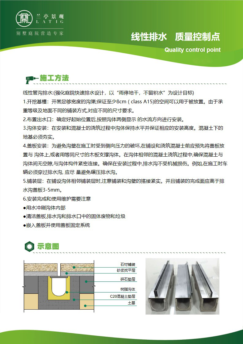 優秀的庭院設計并不是想法天馬行空、效果圖花里胡哨,而是扎扎實實的用心設計,“好用,好看,好玩”這一直是蘭亭景觀的追求。包括庭院快速排水在內的隱蔽工程設計,不僅僅是在考驗一個庭院設計公司的技術水平,更是考驗一個庭院公司的良知。