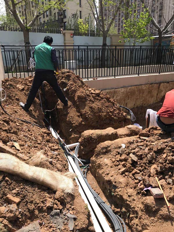 (2)按設計圖標位置先放線,挖溝(草坪區(qū)域}深度30cm以下,檢查無誤后埋置合格的導管,