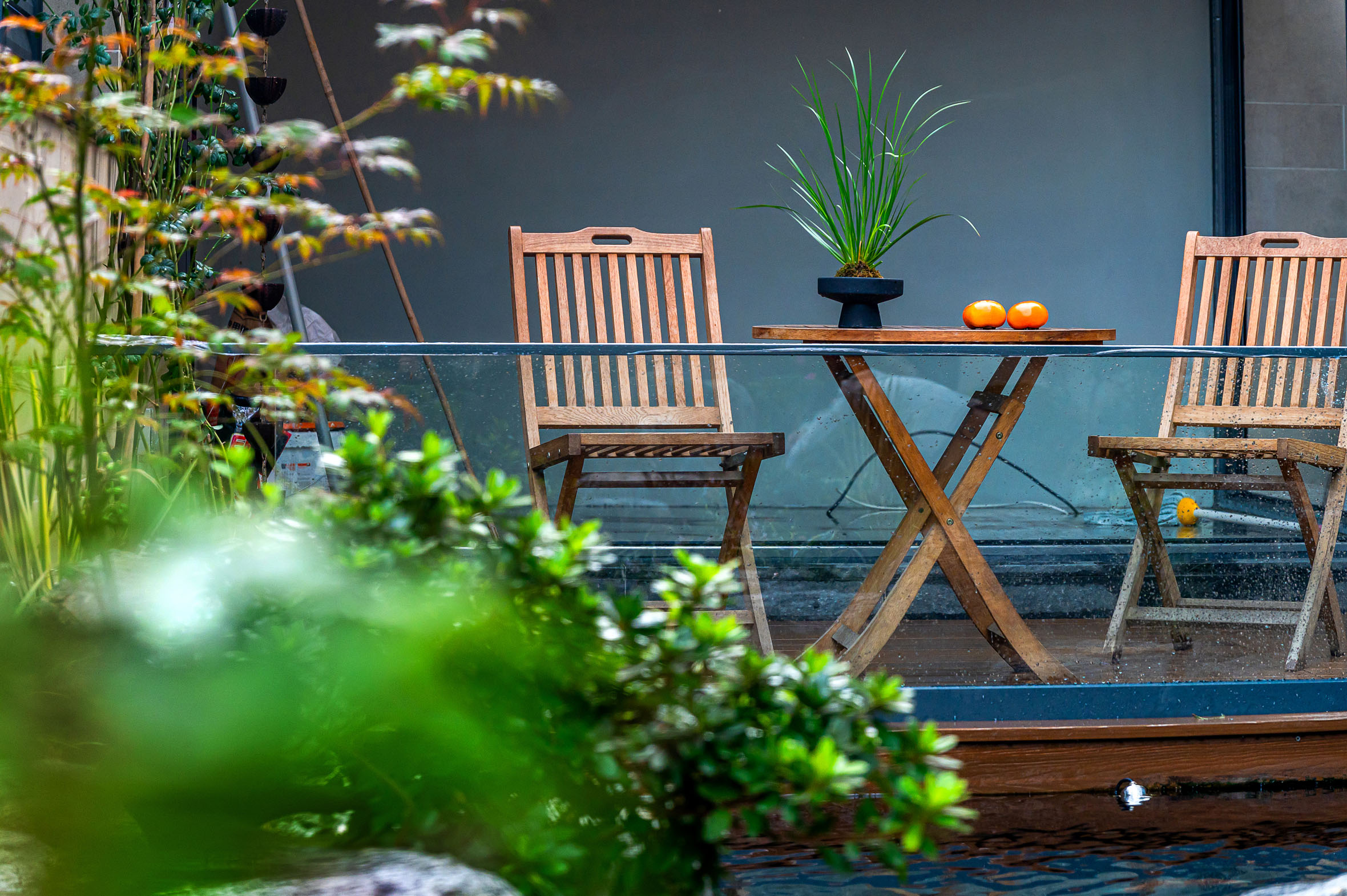 花園的茶室上方是一層的平臺,通過側院臺階下樓后即可到達茶室,也是花園的主要休閑區域,木平臺臨水而建,連接茶室和魚池。閑時與好友家人圍坐茶亭之中,煮茶品茗,風起花香,家就坐落在自然里,不必追尋那未知的遠方,精心布置好自己的一方庭院,散發著屬于“家”的溫情,享受這美好的花園時光。