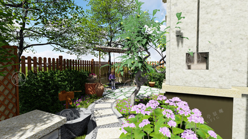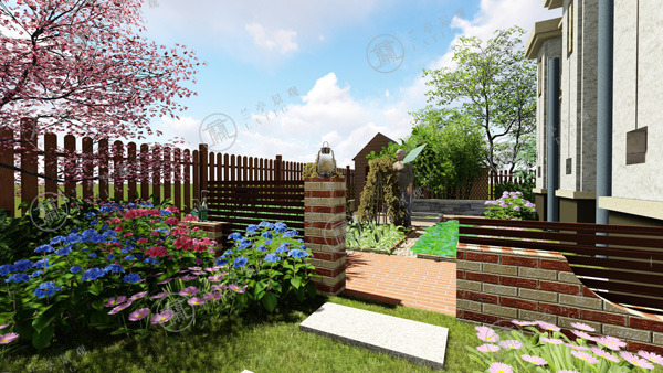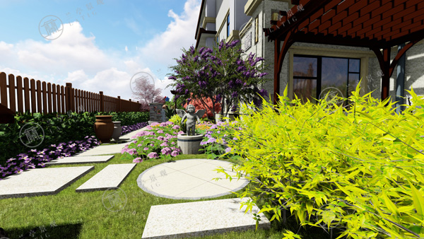 1.整個青島庭院設計分為入口水景、廊下休閑、花徑小路、田園菜地和秋千花園幾大部分。進門處布置樹池,以解決庭院門與建筑門相沖的問題。