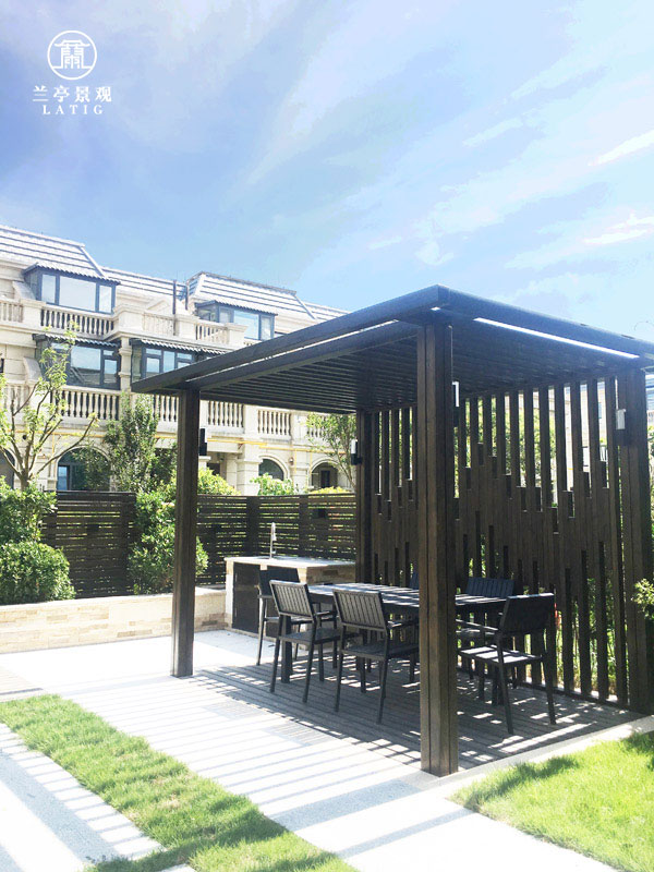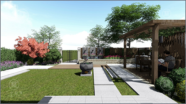 設(shè)計說明:整體設(shè)計上給人以清爽雅致之感,寬敞的布局讓人更加舒適。廊架及木格柵以簡約的造型為基礎(chǔ),加上中式的荷花青石缸擺件,空間層次更加豐富,大而不空、厚而不重,凸顯庭院生活格調(diào)。