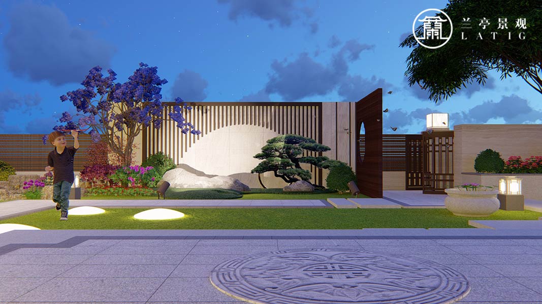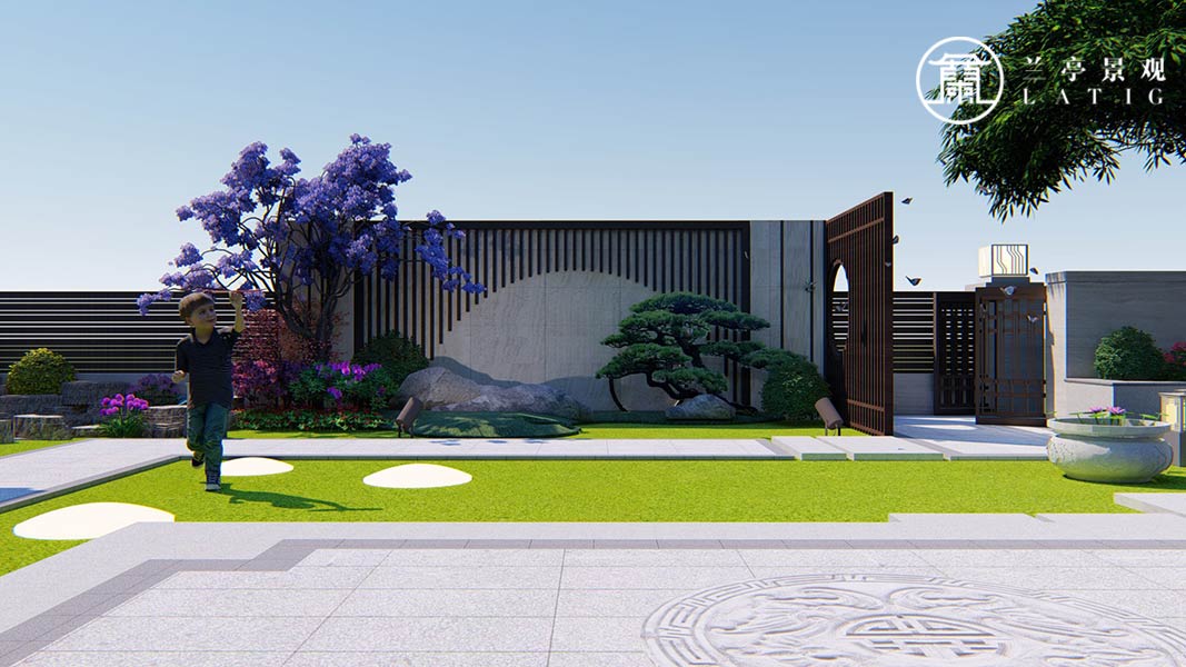 入戶看到是鏤空的格柵景墻,一支滴翠的造型松枝探過來,瀟灑愜意,一條回家的三兩踏步,