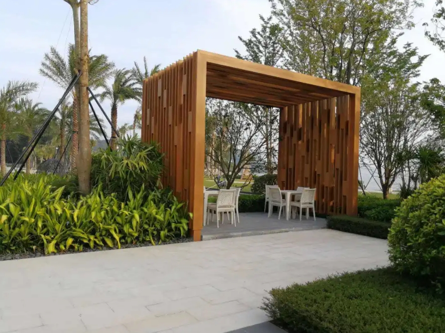 庭院花園中用防腐木做廊架,夏日里可在廊架上布置遮陽布,可以無憂的享受庭院時光,廊架下放置桌椅作為休息區域,閑談歲月靜好。青島別墅庭院設計公司——蘭亭景觀為您介紹。