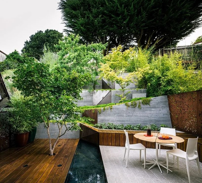 這個花園旨在拓展業主的戶外生活空間。業主的院子有一個陡峭的坡,坡上坡下各有一塊平坦的用地可作為休息場所。為了避免占用過多的庭院面積,采用了高臺地式布局,上面種上了日本楓樹和芳香植物。業主希望將室外座椅區和娛樂區布置在靠近房屋的位置。
