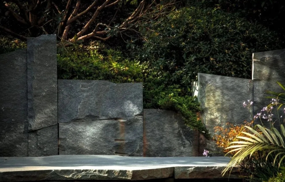 設計師之所以會選擇天然石材,主要因為它的特點是厚重而穩定,而自然斷裂面石材打破了天然石材原有的穩定性和連續性,展現了一種殘缺之美,瞬間就將場景鋪墊成為電影畫面。猶如豐碑一般,給人一種崇高感和滄桑感。這種石材斷裂面帶給人們的視覺沖擊是平板石材無法比擬的。