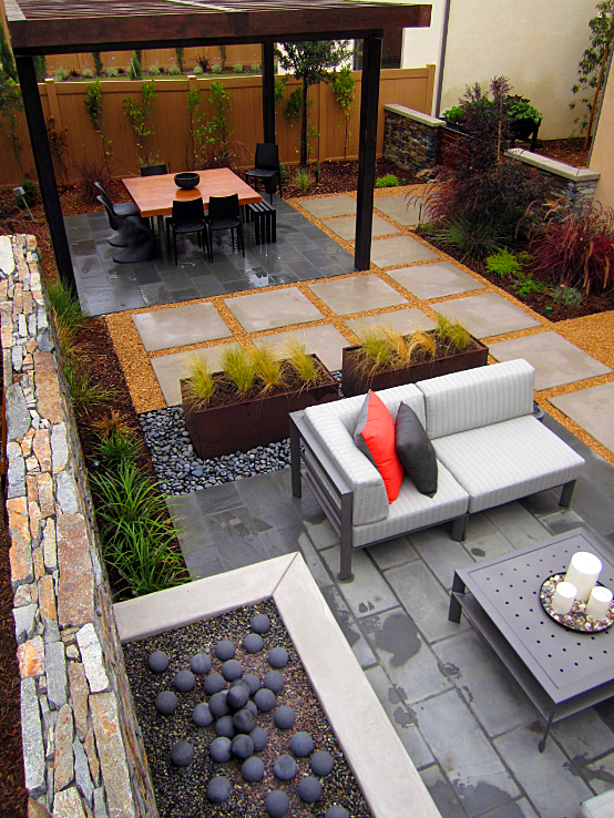 這個花園的設計布局非常的完整精致,功能分區明確,花園滿足了居住者的多方需求。庭院以灰色調為主色,主要材質選用了防腐木、鋼結構作為主要材料。