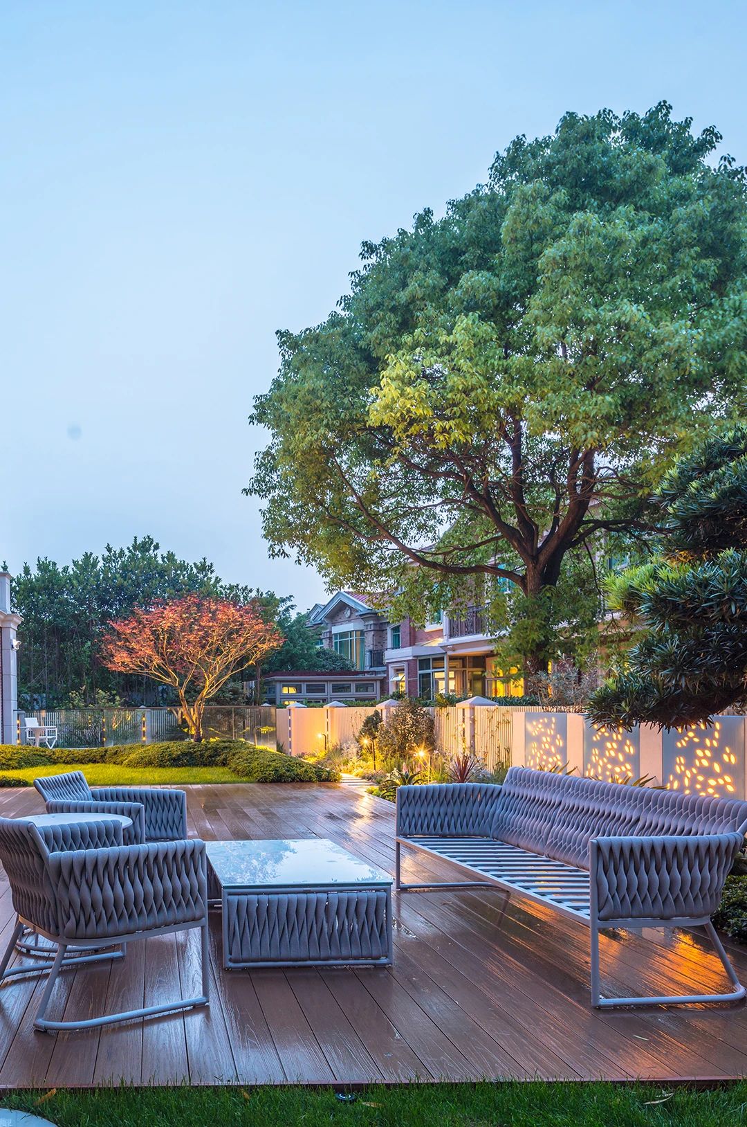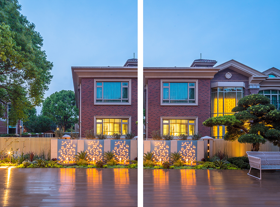 下晚的時候,打開燈光,整個花園的氣氛都會被烘托出來,每個地方,都設計了不同的光線,照射出一個溫暖浪漫的環境。不要小看這些星星點點的小光源,這才是設計師的用心之處。