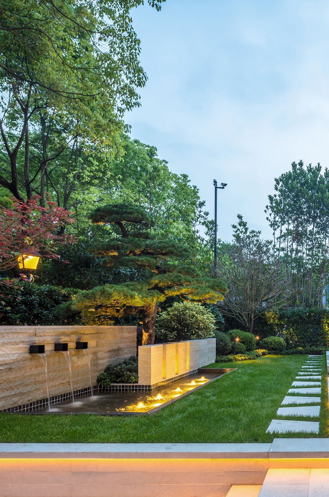 整個花園的亮點很多,但是這塊背景墻晚上的燈光真的是很吸引眼球,前面的小水景給這個區域增加了趣味性。
