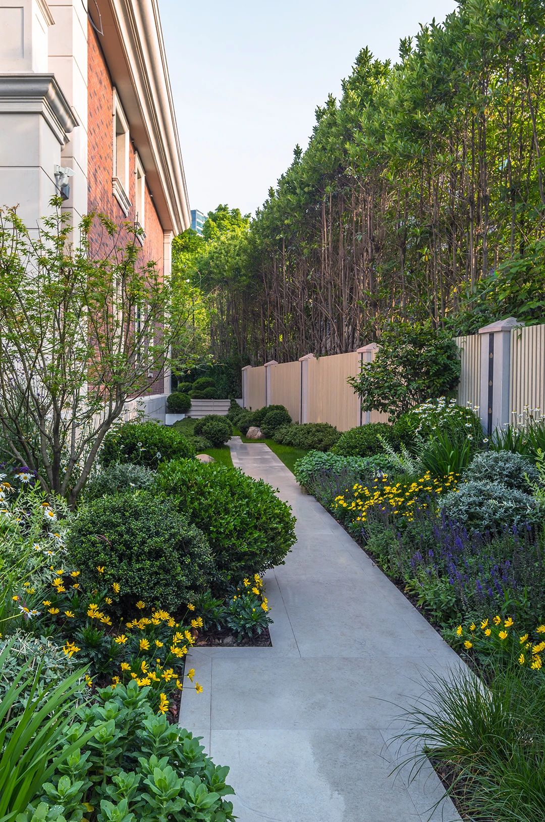 不同的路,采用了不一樣的方式表現,有町步,也有平坦的石板路,旁邊是專業的花境設計師搭配的植物,讓業主可以在不同的季節都感受到春意。青島民宿景觀設計公司——蘭亭景觀為您介紹。