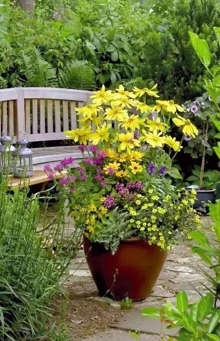 容器組合中的植物搭配要突出主題(如前所述主次分明),顏色不宜太多,一般來講不宜超過3種色調,否則太過于花哨。如果某種色調過重,還應加以適當稀釋。如下圖主色調是黃色(金光菊Rudbekia hirta,蛇目菊Sanvitalia speciosa和皇帝菊melampodium), 由于金光菊很高大,另兩種黃花過于矮小,中間就需加些冷色調紫色( 藍花鼠尾草Salvia farinacea,細葉美女櫻Verbena speciosa和大花夏枯草Prunella grandiflora)過渡中和,否則整盆花色太凝重,結構略為死板。