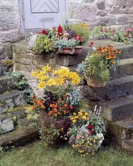 圖中門廊組合容器的擺放也頗有講究:種有黃色金光菊的高大容器擺在正中地勢低的地方,而種有四季海(Begoniasemerplorens)和羽狀雞冠的矮盆擺在最高位,余下則環繞著金光菊,像不像五口之家在門口曬太陽?