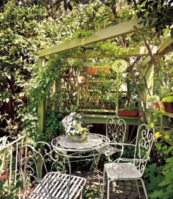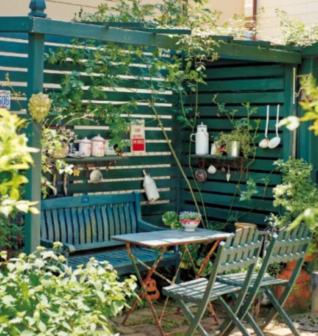 通過控制花園中使用的色彩數量,可以避免讓花園看起來雜亂無章,空間狹小的花園更應如此。例如,將藤架、長椅和花園桌椅都統一成沉穩的綠色調,讓這個區域看起來更有整體感。