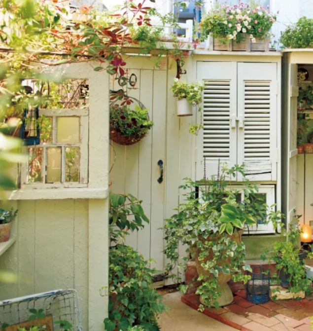 也可以在墻面上打造一些置物架,既可以當作儲物空間,用于收納暫時不用的園藝工具、花盆等,也可以擺上雜貨,成為一個展現主人審美的空間。