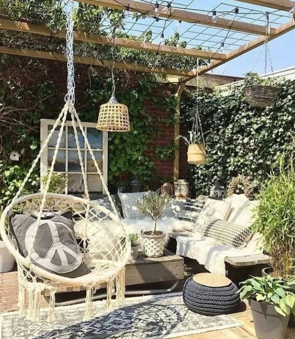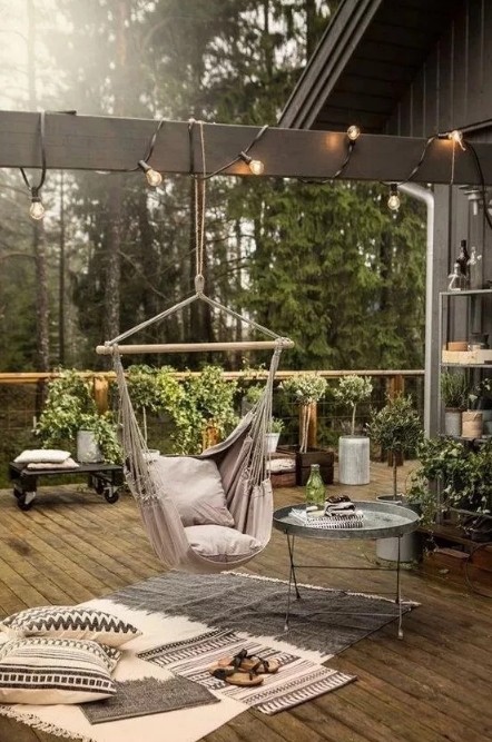 相較于裝修精致、奢華的院子,布藝吊椅更適合簡單、隨性、充滿綠意的田園小院,給人無拘無束、回歸自然的感覺。