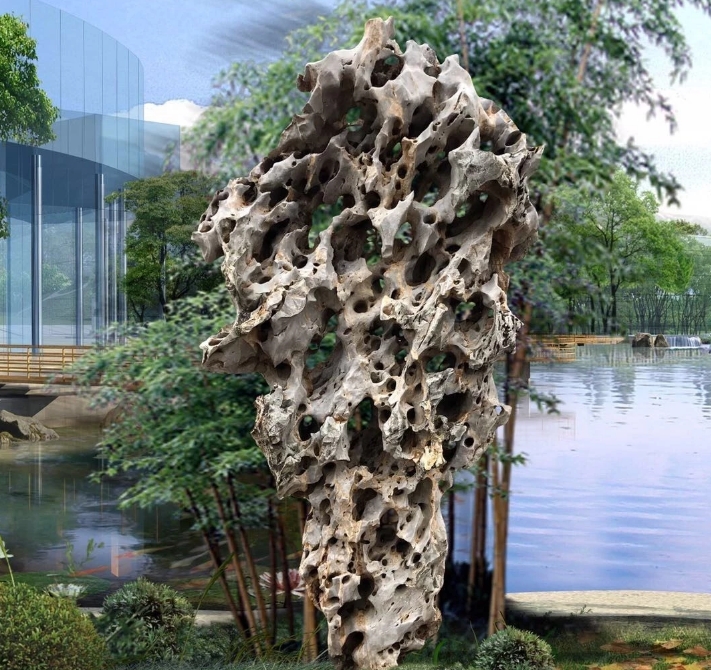 孤置,江南又稱“立峰”,多以整塊體量巨大、造型奇特和質(zhì)地、色彩特殊的石材作成。常用于園林入口的障景和對景,漏窗或地穴的對景。這種石材也可放置于廊間、地下、水邊,作為局部空間的構(gòu)景中心。
