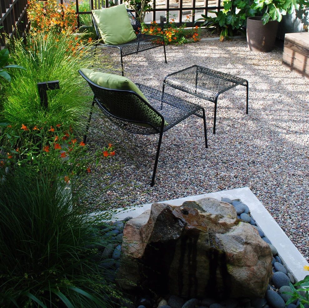 圖為加州一個前院花園,花園設計師伊恩為了節約建造成本,在休閑區和路徑上使用了預制水泥板塊和碎石,而不是造價相對高的石材,花園主可以在后期升級石材鋪裝。青島別墅庭院設計公司——蘭亭景觀為您介紹。