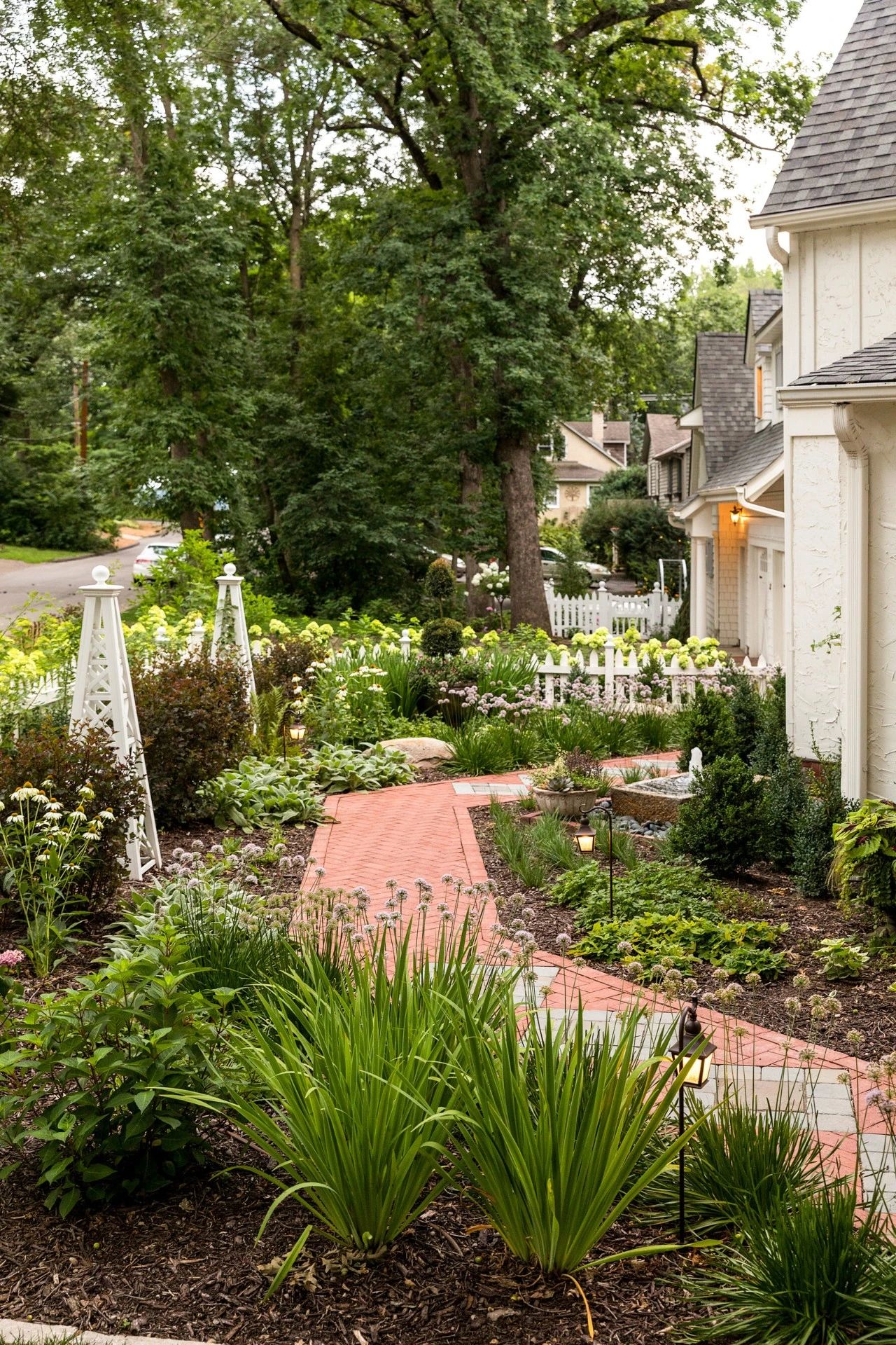 在這座花園里,設(shè)計(jì)師用原有的灰色燒結(jié)磚混合新磚設(shè)計(jì)了一條新的花園小路,小路兩側(cè)是花園原有植物重新移栽組合的花境。白色柵欄也是原有圍欄翻新的,舊圍欄重新刷了木油飾面,柱子上增加新的球帽。