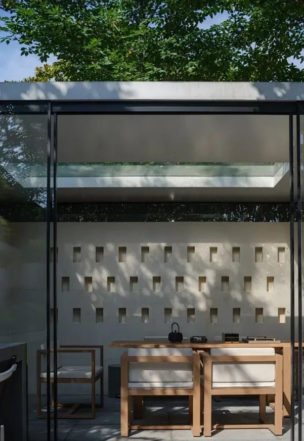 ?簡約的布局?:茶室應以簡約為主,摒棄繁復冗余的裝飾,讓每一寸空間都顯得自由與寧靜。柔和的光線透過窗欞,灑在古樸的木質家具上,營造出和諧的畫面?。青島別墅庭院設計公司——蘭亭景觀為您介紹。