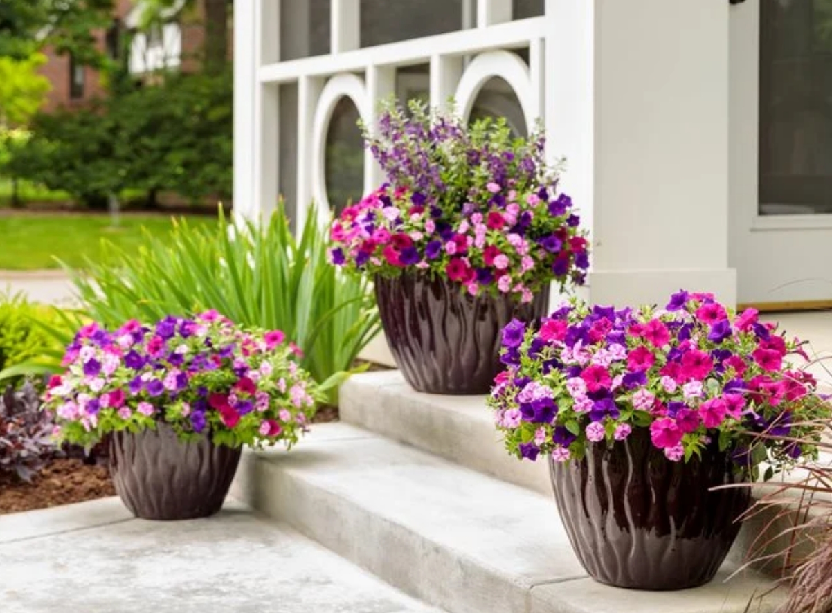 兩種色調的粉紅色和深紫色共同作用,在這個引人注目的容器展示中形成互補的對比。深色容器和中性背景營造出令人愉悅的平衡。青島別墅庭院設計