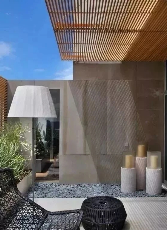 通過添加燈光、戶外地毯和藝術小擺件,讓庭院看起來像房間。當室內室外空間融為一體時,小院在視覺上自然就能顯得寬敞許多。濰坊庭院設計