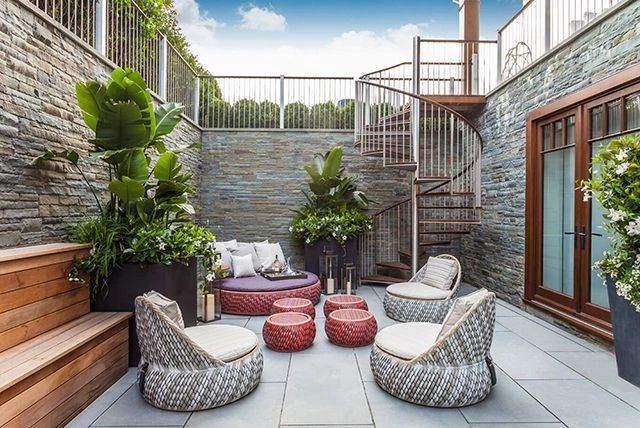 下沉式庭院,在梅雨季節很容易出現潮濕的感覺,所以地面鋪裝時盡量選擇天然的雨花石、戶外磚或防腐木,千萬不要使用軟木框架的家具,軟木會吸潮,容易導致框架受損,可選擇塑料、鋼鐵、石材框架作為代替。