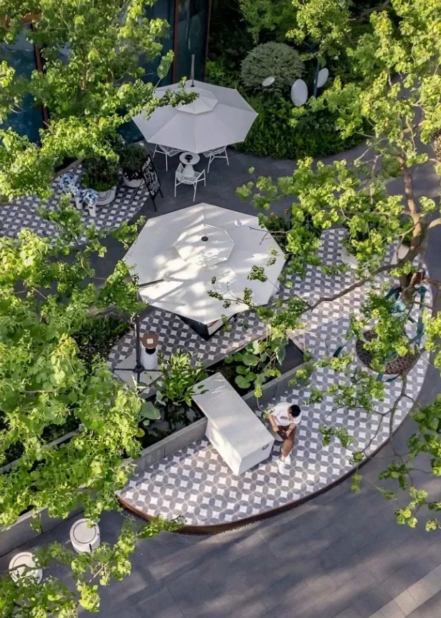 整個設計以草地或礫石為主,保留自然美感。使用木質家具或鐵藝家具,增加自然的氛圍,同時提升舒適度。可以選擇戶外木的樹池卡座,橄欖樹、金合歡、棕櫚樹、鳥蕉等作為主要綠化,增添度假放松的美感?。青島庭院設計