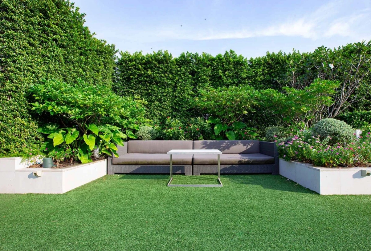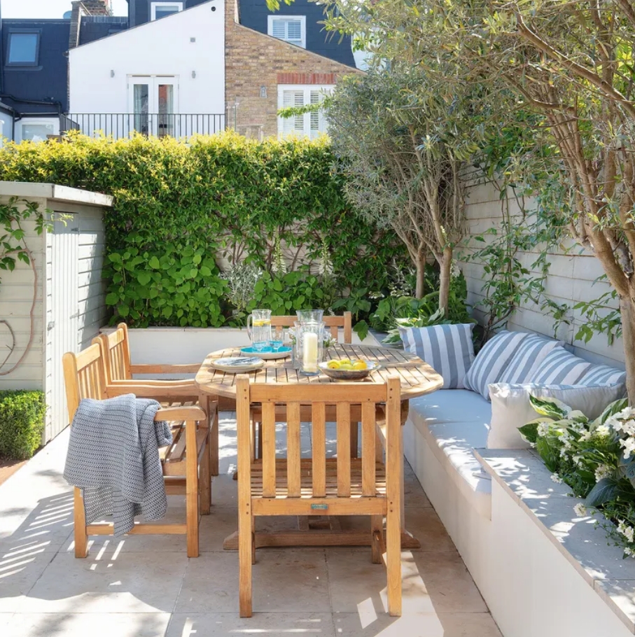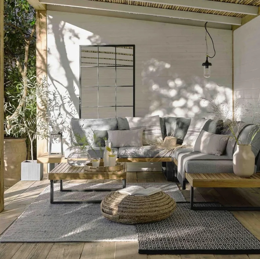 花園是生活空間的擴展,因此,可以和室內設計對標,在沙發下搭配戶外地毯。戶外地毯可以在硬地面上提供柔軟和舒適的踩踏感,使戶外空間更適合休息和放松。大多數戶外地毯設計具有防滑功能,還有助于減少在潮濕或濕潤的戶外環境中滑倒的風險,如果家里有孩子的話,鋪設地毯可以大大提高花園的安全性。