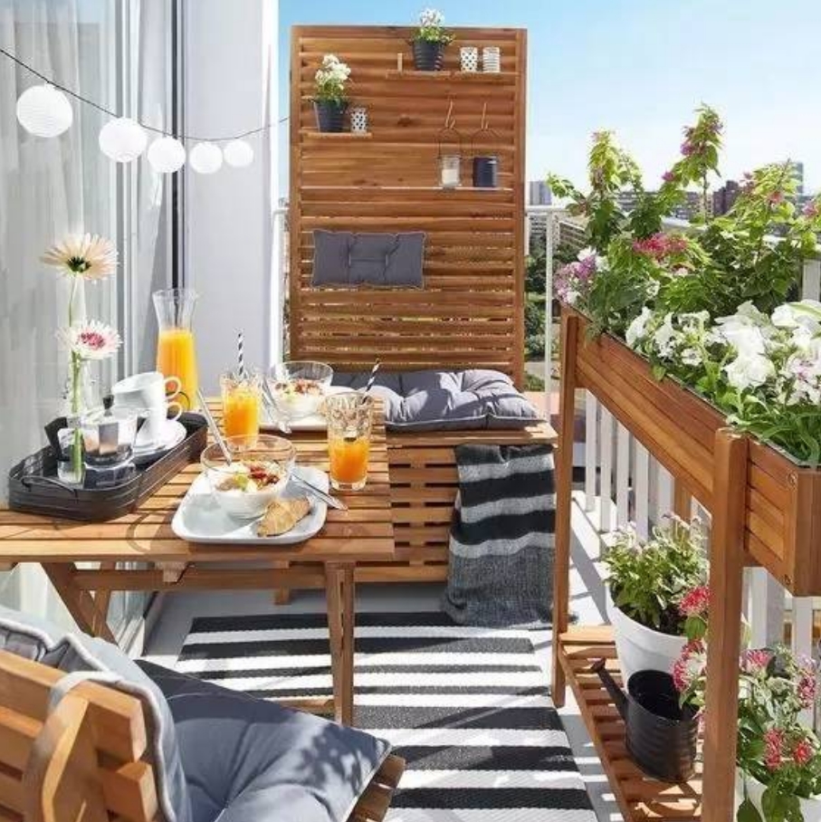 如果家中落地陽臺夠大,不妨選購一張與室內家具色彩一致或截然相反戶外休閑桌,再配上兩個四方矮凳,并在其旁邊裝點上幾盆綠色植物,不僅能讓窄小的陽臺變得寬敞一些,還能刻意營造出一個四合小院的景致。