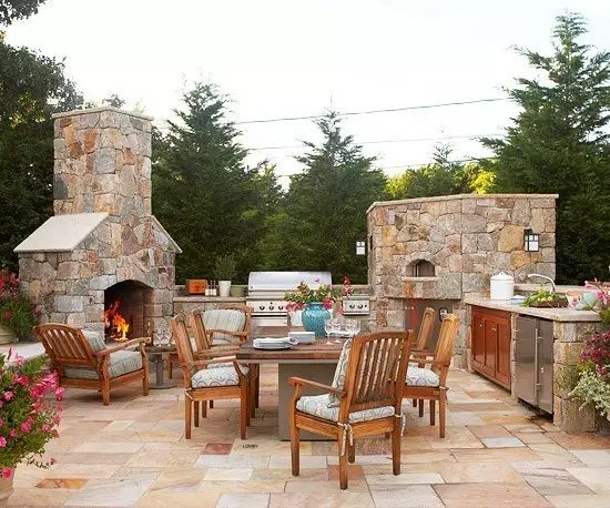 用石頭鋪設地板,可以讓你的庭院緩和、不突兀地過渡到庭院周圍的石徑——但為什么不設計并建造一個具有一定高度的石凳,為客人提供座位?因為壁爐附近的的矮墻已為客人坐供應了一個即興的現(xiàn)場座位了。