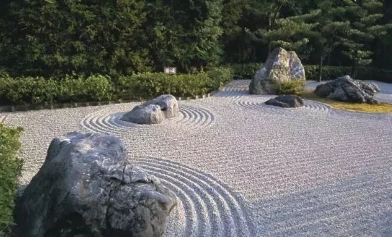 枯山水,顧名思義,就是不是真的山水,枯山水的“水”材質主要是白砂,“山”采用當地特有的石材營造而成,也可以看作是島嶼。白砂通過被耙制營造成泛起漣漪的水,達到無水似有水的效果。