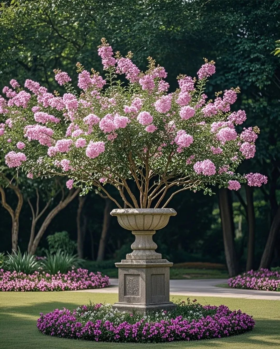 叢生紫薇與木槿交替配置,延長夏季花期的觀賞時間。前者6-9月的綿長花期與后者7-10月的次第開放,形成持續四個月的花瀑效果。配置兩三種不同花期的灌木,確保每個視角都有綻放的焦點。