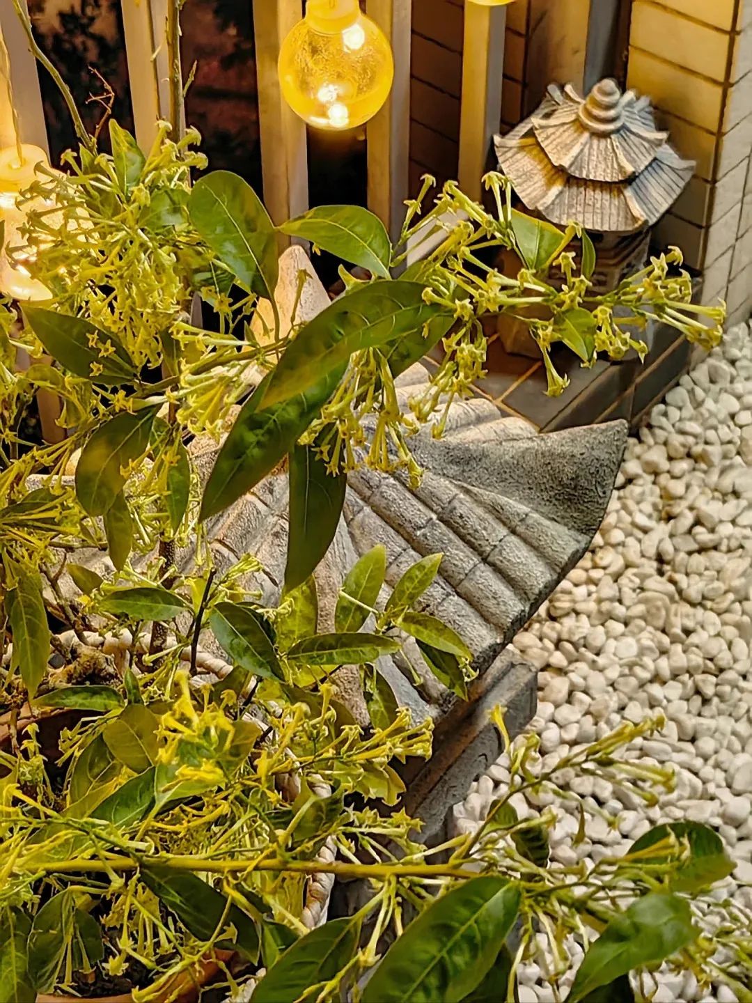 晚香玉與梔子組成嗅覺矩陣,白花鬼針草與銀葉菊構成反光群落,配合照明燈光,使庭院在夜間煥發珍珠般的光澤。