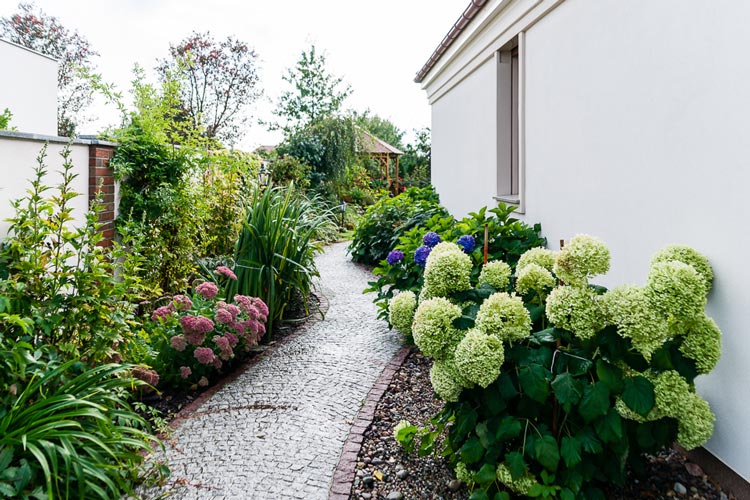 如果你特別喜歡種植花草的話,可以在進行私家別墅花園設計時采用這樣的方式。別墅花園的側面只一條簡單的小徑,將其一分為二,邊上種植上翠綠蘢蔥的各色植物,尤其是這繡球可愛極了。