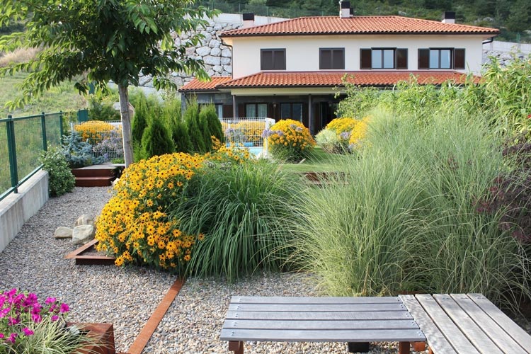 這套私家別墅花園設計采用 非常舒適自然的別墅花園布局方式。地面采用礫石做鋪裝,叢生的各種花草點綴于庭院各處很有野趣。