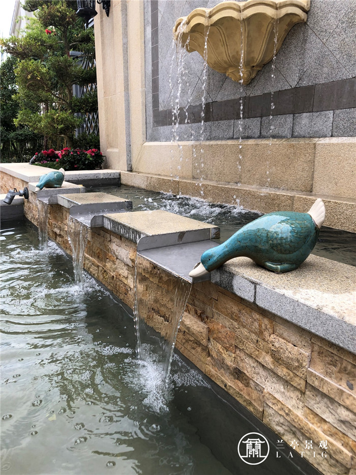 一面墻,兩棵樹,三層水,通過簡單的搭配組合形成一幅優美的畫卷。