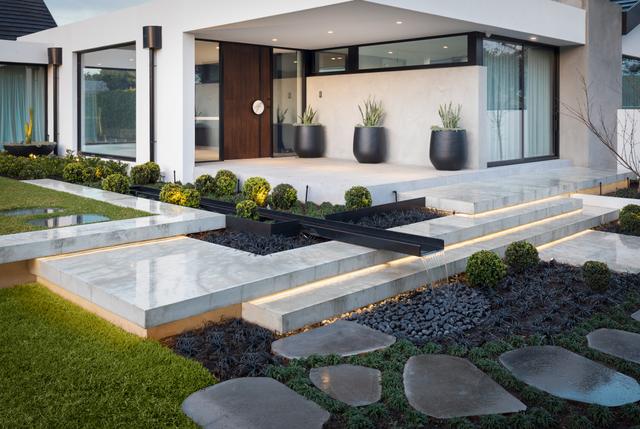 水景墻是庭院里最讓人放松的景觀裝置,噴泉水墻是比較傳統的設計方式,但能帶給花園一種極簡和清新的面貌。動態的噴水效果能打破整面墻的厚重感,將一靜一動的景觀元素結合在一起,使整個花園更具活力。