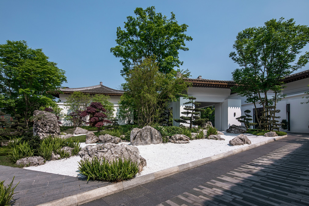 枯山水追求灑脫淡泊、脫離塵世的外在美,重視內在的永恒感和歸屬感,它以白砂為水,石塊做山,避免了水體的變幻莫測,除去了花草樹木的交替枯榮。